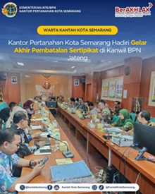 Semarang — Kantor Pertanahan Kota Semarang turut berpartisipasi dalam kegiatan Gelar Akhir Permohonan Pembatalan Sertipikat yang diselenggarakan oleh Kantor Wilayah Badan Pertanahan Nasional ... Selengkapnya