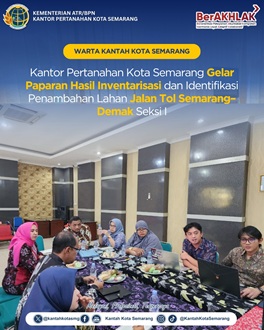 Semarang — Kantor Pertanahan Kota Semarang menyelenggarakan paparan internal hasil inventarisasi dan identifikasi (Inven & Inden) bidang tanah yang terdampak pengadaan tanah untuk penamba... Selengkapnya